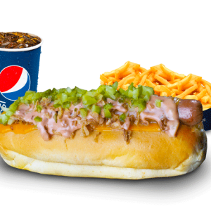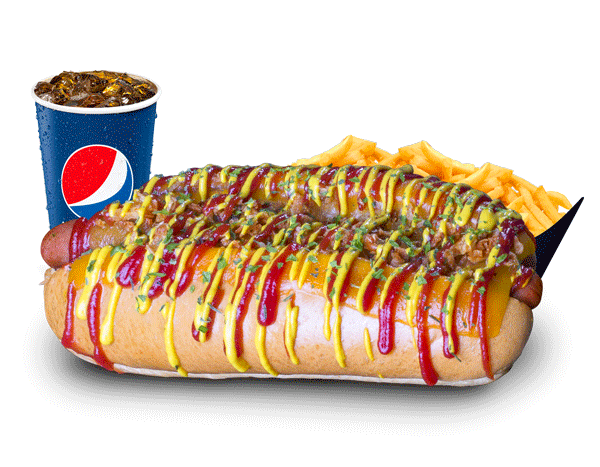 Pain brioché, saucisse de bœuf, cheddar, oignons frits, sauce moutarde et sauce ketchup.
